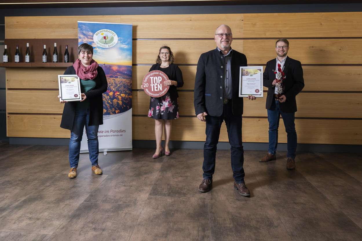 TOP TEN Spätburgunder Rotwein Sieger Platz 1-3 im Weinparadies Ortenau: Meinrad Schmiederer / Hotel Dollenberg, Hanna Mußler / Badische Weinprinzessin 2019-21, Hanspeter Rieflin / Kellermeister WG Schloss Ortenberg, Heinz-Josef Knapp / Weingut Knapp, Thomas Hirt / Kellermeister Winzerkeller Hex vom Dasenstein (WPO Jigal Fichtner)